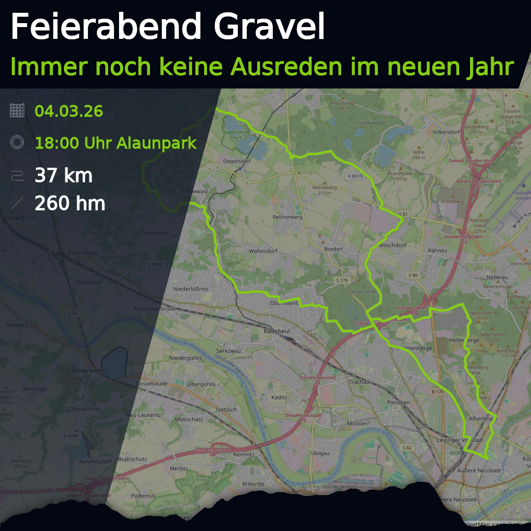 Wir starten fast alle unsere Touren am Alaunpark in der Dresdner Neustadt. Meistens treffen wir uns direkt an der großen Wiese oder am Skatepark. Schau immer kurz in die Ride-Details für den exakten Pin.